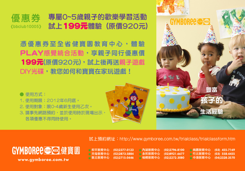 即日起至2011年6月底,網路預約並列印本券至全省健寶園教育中心體驗「PLAY & LEARN感覺統合活動」,享親子同行優惠價$199元(原價$920元),再送「親子遊戲DIY光碟」,教您在家和寶寶玩遊戲! 健寶園網站 http://www.gymboree.com.tw